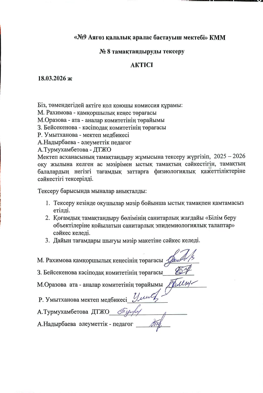 » Бракеражды комиссиясы мектеп асханасының тамақтандыру жұмысына тексеру жүргізді